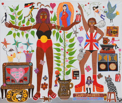 Today, Whiskey’s art draws on that rich and eclectic set of influences to remix celebrity culture and remote community life, as pop idols like Tina Turner, Dolly Parton and Wonder Woman are dropped into the red dirt and blue skies of Central Australia.